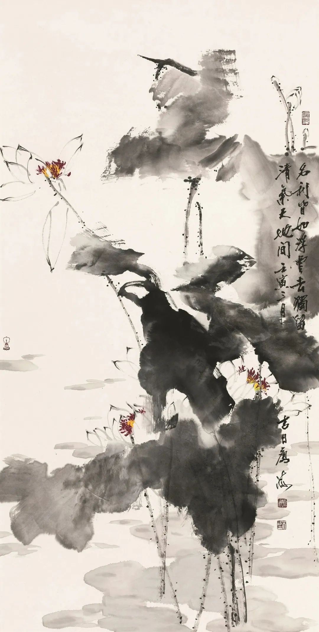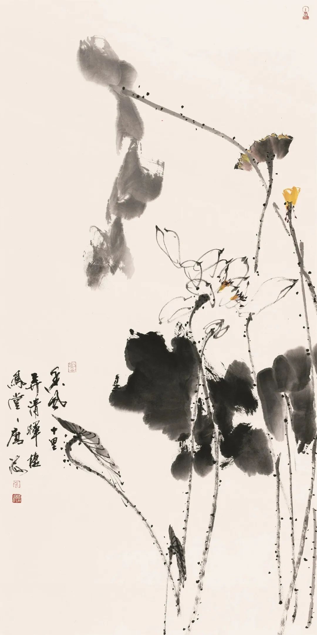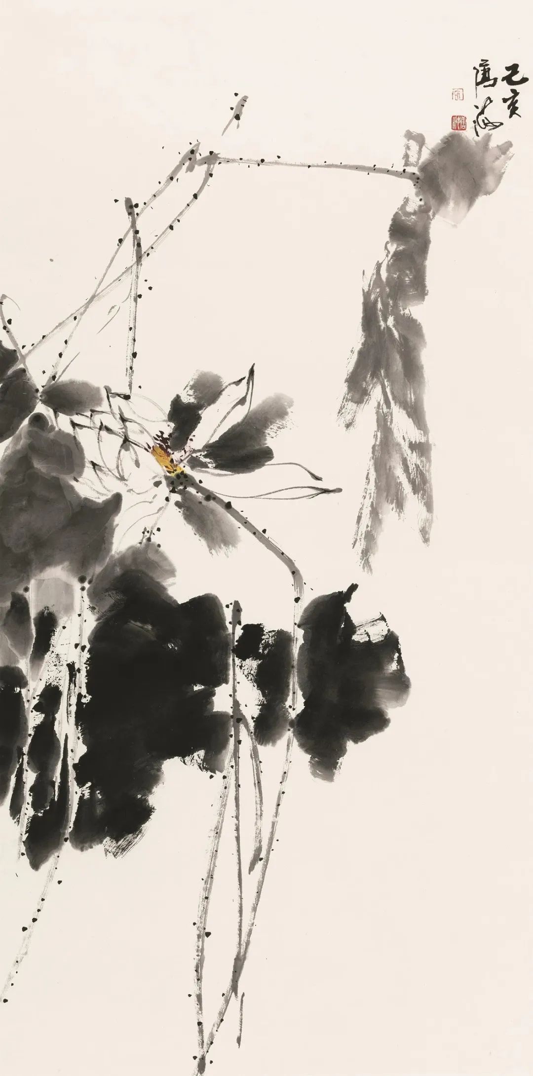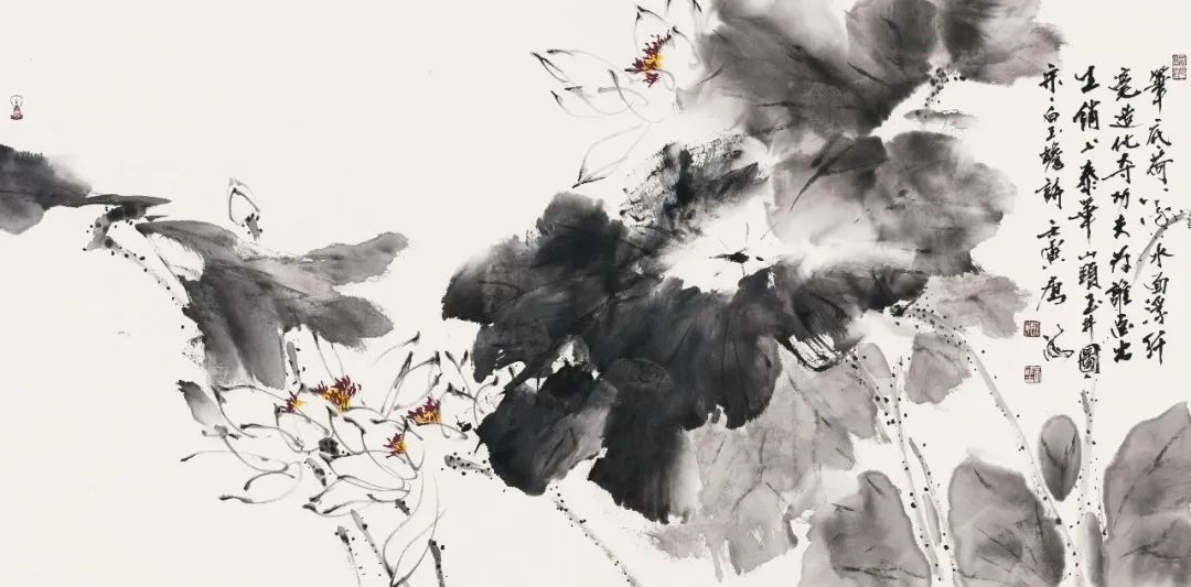 在处理细节时,他用犀利的笔触刻画荷叶的纹理和荷梗的毛刺,使画面更加生动逼真。这种泼辣的表现手法,让墨荷大写意作品充满了生命力和活力。
